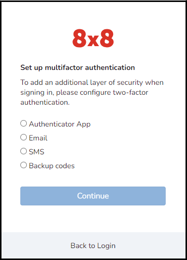 After the MFA is enabled, during the first login, configure the two-factor authentication for your account. Choose one of the available options: Authenticator apps, SMS, or E-mail, and click Continue.